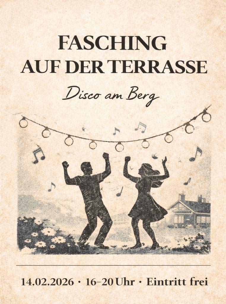 Musik und Tanz auf der Terrasse, dazu Sprudel, Punsch und andere Köstlichkeiten. Zur Stärkung servieren wir ein gutes Kartoffelgulasch. Feiert mit uns den Fasching am Berg!