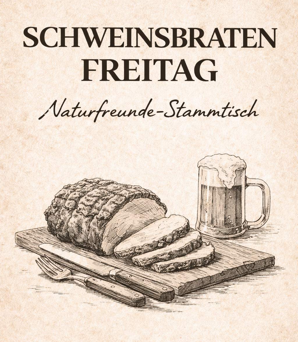 Wenn der Duft von frisch gebratenem Schweinsbraten durch die Hütte zieht, ist wieder Stammtisch-Zeit. In gemütlicher Runde treffen sich Naturfreunde, Genießer und alle, die gutes Essen und gute Gespräche schätzen.